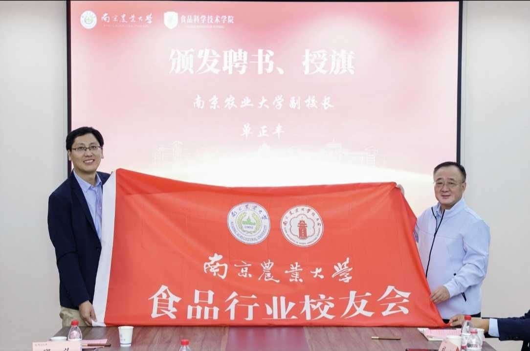 在庄重的音乐声中,伟德betvlctor体育官网副校长单正丰为第二届理事会会长、副会长颁发聘书,并举行了隆重的授旗仪式。鲜红的会旗象征着使命的传递与责任的延续,标志着食品行业校友会正式开启新的征程。